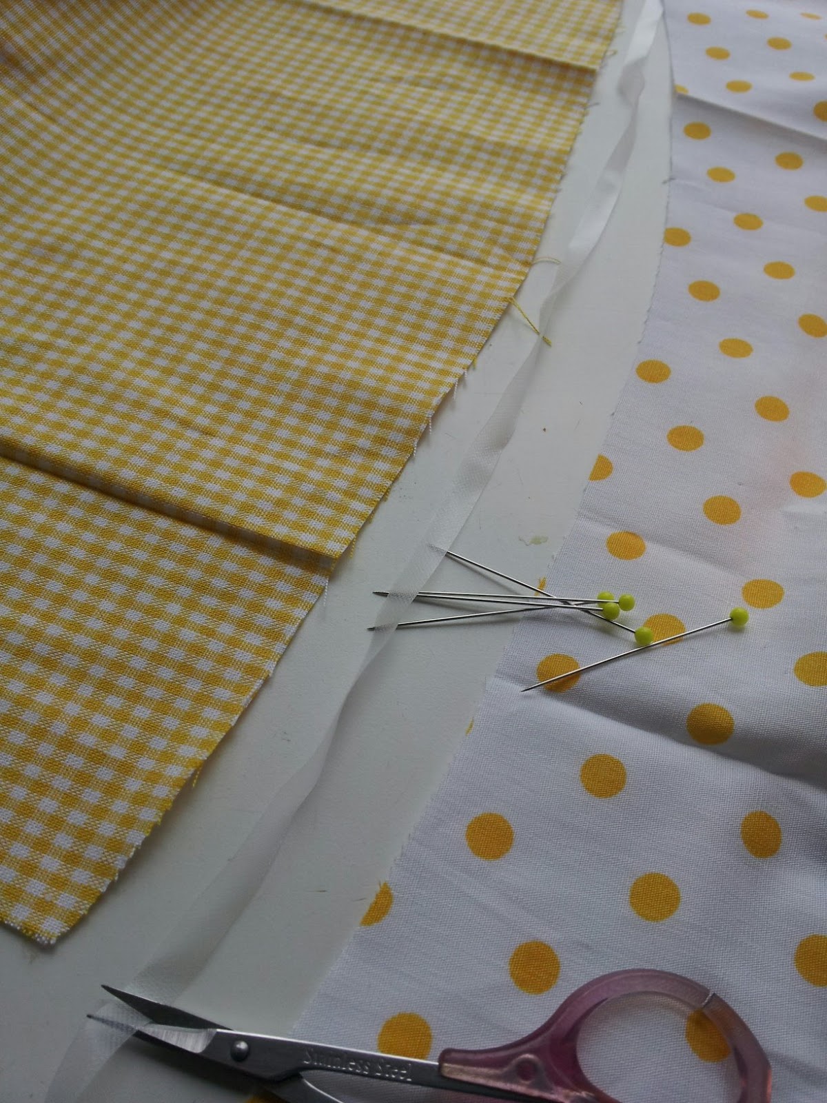 1. Zunächst braucht ihr eure Stoffstücke und Framilastic. Bei meinem Beispiel soll das gepunktete Teil auf die Länge des karierten gekräuselt werden.